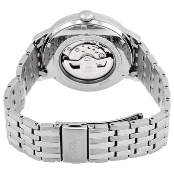 Stainless steel case with a stainless steel bracelet. Fixed stainless steel bezel. Black dial with silver-tone hands and index hour markers. Arabic numerals appear at the 6, 9 and 12 o'clock positions. Minute markers around the outer rim. Dial Type: Analog. Date display at the 3 o'clock position. Automatic movement. Scratch resistant Hardlex crystal. Pull / push crown. Solid case back. Round case shape. Case size: 42 mm. Case thickness: 12 mm. Band width: 20 mm. Fold over clasp with a double push button release. Water resistant at 50 meters / 165 feet. Functions: date, hour, minute, second. Classic Series. Casual watch style. Orient Classic Automatic Black Dial Men's Watch RA-AC0J08B10B.