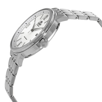 Silver-tone stainless steel case and bracelet. Fixed silver-tone stainless steel bezel. Silver dial with silver-tone alpha-style hands and index hour markers. Arabic numerals mark the 6, 9 and 12 o'clock positions. Minute markers around the outer rim. Dial Type: Analog. Date display at the 3 o'clock position. Orient Calibre F6722 Automatic movement, containing 22 Jewels, bitting at 21600 vph, and has a power reserve of approximately 40 hours. Scratch resistant sapphire crystal. Pull / push crown. Transparent case back. Round case shape, case size: 42.4 mm, case thickness: 11.2 mm. Band width: 20 mm. Fold over clasp with a safety release. Water resistant at 50 meters / 165 feet. Functions: date, hour, minute, second. Classic Series. Casual watch style. Watch label: Japan Movt. Orient Classic Automatic Silver Dial Men's Watch RA-AC0J10S10B.
