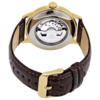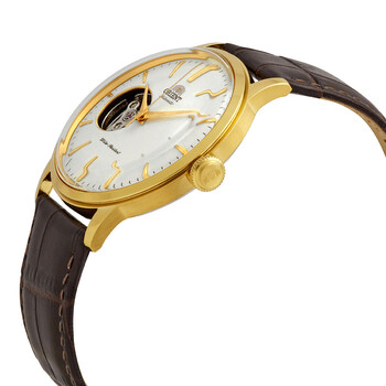 Gold-tone stainless steel case with a brown leather strap. Fixed gold-tone bezel. Silver (open heart) dial with gold-tone hands and index hour markers. Minute markers around the outer rim. Dial Type: Analog. Orient calibre F6T22 Automatic movement, containing 22 Jewels, bitting at 21600 vph, and has a power reserve of approximately 40 hours. Scratch resistant mineral crystal. Pull / push crown. Transparent case back. Round case shape. Case size: 40.5 mm. Case thickness: 12 mm. Band width: 21 mm. Tang clasp. Water resistant at 30 meters / 100 feet. Functions: hour, minute, second. Casual watch style. Watch label: Japan Movt. Orient Classic Automatic Silver Dial Men's Watch RA-AG0003S.