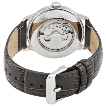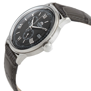 Silver-tone stainless steel case with a leather strap. Fixed silver-tone stainless steel bezel. Black dial with silver-tone hands and Roman numeral hour markers. Arabic numeral minute markers (at 5 minute intervals). Dial Type: Analog. Date display at the 3 o'clock position. Two sub-dials displaying: day and 24 hour. Orient Calibre F6B22 Automatic movement, containing 22 Jewels, bitting at 21600 vph, and has a power reserve of approximately 40 hours. Scratch resistant mineral crystal. Transparent case back. Round case shape, case size: 40.5 mm, case thickness: 13 mm. Tang clasp. Water resistant at 30 meters / 100 feet. Functions: date, day, GMT, second time zone, hour, minute, second. Classic Bambino 2nd Generation Series. Sport watch style. Watch label: Japan Movt. Orient Classic Bambino 2nd Generation GMT Automatic Black Dial Men's Watch RA-AK0704.