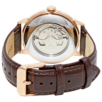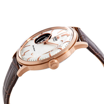 Rose gold PVD stainless steel case with a brown leather strap. Fixed rose gold PVD bezel. White dial (with a skeletal window) with rose gold-tone hands and index hour markers. Minute markers around the outer rim. Dial Type: Analog. Orient calibre F6T22 automatic movement with a 40-hour power reserve. Scratch resistant mineral crystal. Pull / push crown. Transparent case back. Round case shape. Case size: 40.5 mm. Case thickness: 12 mm. Band width: 20 mm. Tang clasp. Water resistant at 30 meters / 100 feet. Functions: hour, minute, second. Dress watch style. Watch label: Japan Movt. Orient Classic Open Heart Automatic White Dial Men's Watch RA-AG0001S10B.