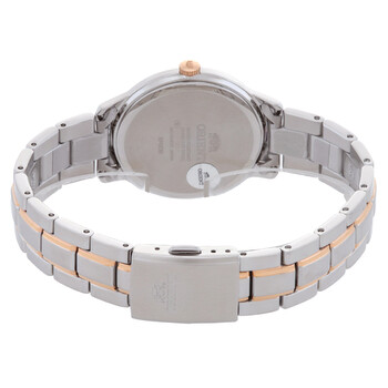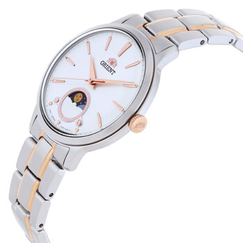 Silver-tone stainless steel case with a two-tone (silver-tone and rose gold-tone) stainless steel bracelet. Fixed silver-tone stainless steel bezel. White dial with rose gold-tone hands and index hour markers. Minute markers around the outer rim. Dial Type: Analog. Moon phase subdials. Quartz movement. Scratch resistant mineral crystal. Pull / push crown. Solid case back. Round case shape, case size: 34 mm, case thickness: 8 mm. Water resistant at 30 meters / 100 feet. Functions: hour, minute, second. Classic Series. Casual watch style. Watch label: Japan Movt. Orient Classic Quartz White Dial Ladies Watch RA-KB0001S10B.