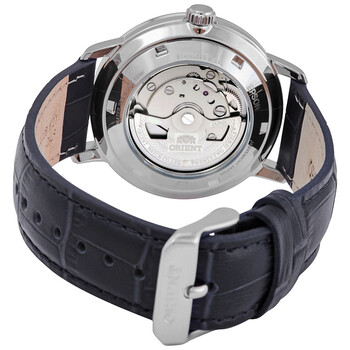 Stainless steel case with a dark blue leather strap. Fixed stainless steel bezel. Blue dial with silver-tone pencil-style hands and index hour markers. Minute markers around the outer rim. Dial Type: Analog. Date display at the 3 o'clock position. Orient calibre F6722 automatic movement, containing 22 Jewels, bitting at 21600 vph, and has a power reserve of approximately 40 hours. Scratch resistant mineral crystal. Pull / push crown. Semi transparent case back. Round case shape. Case size: 40 mm. Case thickness: 13 mm. Band width: 20 mm. Tang clasp. Water resistant at 100 meters / 330 feet. Functions: date, hour, minute, second. Casual watch style. Watch label: Japan Movt. Orient Contemporary Automatic Blue Dial Men's Watch RA-AC0E04L10B.