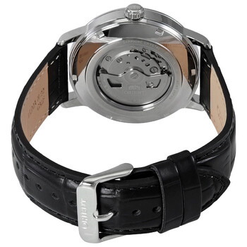 Stainless steel case with a black leather strap. Fixed stainless steel bezel. Blue dial with silver-tone hands and Roman & index hour markers. Roman numerals appear at the 3, 6, 9 and 12 o'clock positions. Minute markers around the outer rim. Dial Type: Analog. Date display at the 3 o'clock position. Automatic movement. Scratch resistant sapphire crystal. Pull / push crown. Solid case back. Round case shape. Case size: 42 mm. Case thickness: 12 mm. Band width: 22 mm. Tang clasp. Water resistant at 50 meters / 165 feet. Functions: date, hour, minute, second. Contemporary Series. Casual watch style. Watch label: Japan Movt. Orient Contemporary Automatic Blue Dial Men's Watch RA-AC0F11L10B.