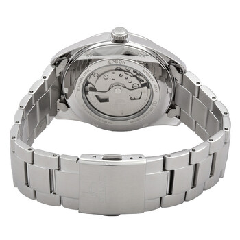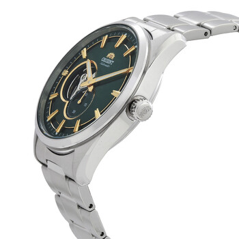 Silver-tone stainless steel case and bracelet. Fixed silver-tone stainless steel bezel. Green dial with gold-tone hands and index hour markers. Minute markers around the outer rim. Dial Type: Analog. Luminescent hands. One subdial displaying: small second. Orient Calibre F6S22 automatic movement with a 40-hour power reserve. Scratch resistant sapphire crystal. Pull / push crown. Transparent case back. Round case shape, case size: 40.8 mm, case thickness: 10.9 mm. Band width: 22 mm. Fold over clasp with a safety release. Water resistant at 50 meters / 165 feet. Functions: hour, minute, small second. Contemporary Series. Casual watch style. Watch label: Japan Movt. Orient Contemporary Automatic Green Dial Men's Watch RA-AR0008E10B.