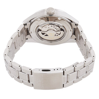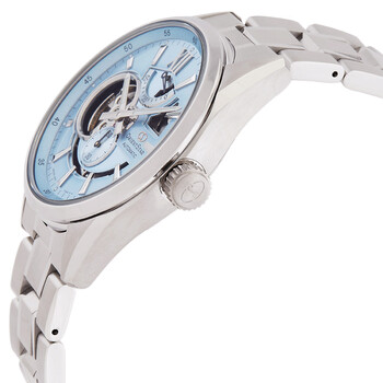 Silver-tone stainless steel case and bracelet. Fixed silver-tone stainless steel bezel. Sky blue dial with silver-tone hands and index-Roman numeral hour markers. Minute markers around the outer rim. Dial Type: Analog. 60 seconds, power reserve indicator subdials. Orient Calibre F6F44 automatic movement. Scratch resistant sapphire crystal. Transparent see through case back. Round case shape, case size: 41 mm. Fold over clasp with a safety release. Water resistant at 100 meters / 330 feet. Functions: hour, minute, second, power reserve. Contemporary Series. Sport watch style. Watch label: Japan Movt. Orient Contemporary Automatic Sky Blue Dial Watch RE-AV0127L.