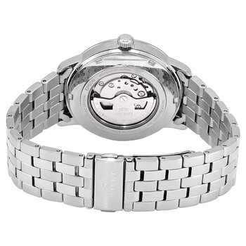 Stainless steel case with a stainless steel bracelet. Fixed stainless steel bezel. White dial with silver-tone hands and index hour markers. Roman numerals appear at the 3, 6, 9 and 12 o'clock positions. Minute markers around the outer rim. Dial Type: Analog. Date display at the 3 o'clock position. Automatic movement. Scratch resistant sapphire crystal. Pull / push crown. Transparent case back. Round case shape. Case size: 42 mm. Case thickness: 12 mm. Band width: 22 mm. Fold over clasp. Water resistant at 50 meters / 165 feet. Functions: date, hour, minute, second. Contemporary Series. Casual watch style. Watch label: Japan Movt. Orient Contemporary Automatic White Dial Men's Watch RA-AC0F10S10B.