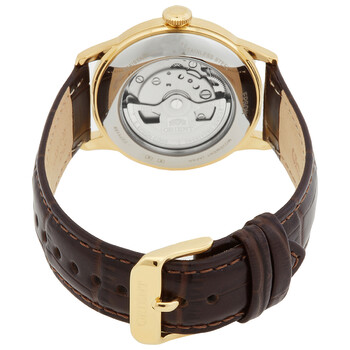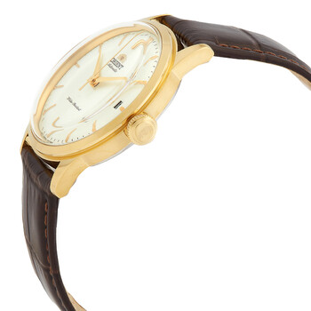 Yellow gold-tone stainless steel case with a brown leather strap. Fixed yellow gold-tone stainless steel bezel. White dial with yellow gold-tone hands and index hour markers. Minute markers around the outer rim. Dial Type: Analog. Date display at the 3 o'clock position. Automatic movement. Scratch resistant mineral crystal. Pull / push crown. Transparent case back. Round case shape, case size: 38.4 mm, case thickness: 12.5 mm. Band width: 20 mm. Tang clasp. Water resistant at 30 meters / 100 feet. Functions: date, hour, minute, second. Contemporary Classic Series. Casual watch style. Orient Contemporary Classic Automatic White Dial Men's Watch RA-AC0M01S10B.
