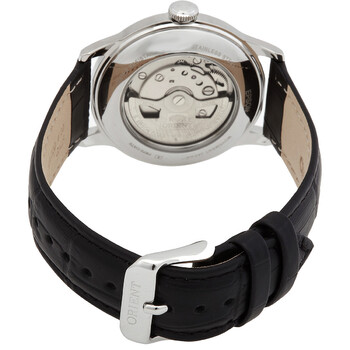 Silver-tone stainless steel case with a black leather strap. Fixed silver-tone stainless steel bezel. Black dial with silver-tone hands and index hour markers. Minute markers around the outer rim. Dial Type: Analog. Date display at the 3 o'clock position. Automatic movement. Scratch resistant mineral crystal. Pull / push crown. Transparent case back. Round case shape, case size: 38.4 mm, case thickness: 12.5 mm. Band width: 20 mm. Tang clasp. Water resistant at 30 meters / 100 feet. Functions: date, hour, minute, second. Contemporary Classic Series. Casual watch style. Orient Contemporary Classic Black Dial Men's Watch RA-AC0M02B10B.