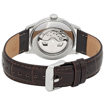 Silver-tone stainless steel case with a brown leather strap. Fixed silver-tone stainless steel bezel. Champagne dial with black hands and index hour markers. Minute markers around the outer rim. Dial Type: Analog. Date display at the 3 o'clock position. Automatic movement. Scratch resistant mineral crystal. Pull / push crown. Transparent case back. Round case shape, case size: 38.4 mm, case thickness: 12.5 mm. Band width: 20 mm. Tang clasp. Water resistant at 30 meters / 100 feet. Functions: date, hour, minute, second. Contemporary Classic Series. Casual watch style. Orient Contemporary Classic Champagne Dial Men's Watch RA-AC0M04Y10B.