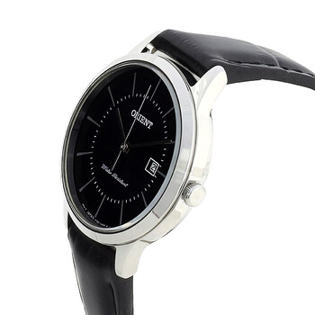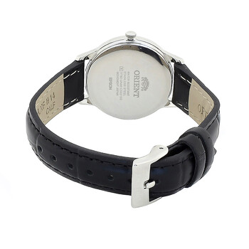 Silver-tone stainless steel case with a black leather strap. Fixed silver-tone stainless steel bezel. Blue dial with silver-tone hands and index hour markers. Minute markers around an inner ring. Dial Type: Analog. Date display at the 3 o'clock position. Quartz movement. Scratch resistant mineral crystal. Pull / push crown. Solid case back. Round case shape, case size: 30 mm, case thickness: 7 mm. Band width: 14 mm. Tang clasp. Water resistant at 30 meters / 100 feet. Functions: date, hour, minute, second. Contemporary Series. Casual watch style. Watch label: Japan Movt. Orient Contemporary Quartz Blue Dial Ladies Watch RF-QA0005L.