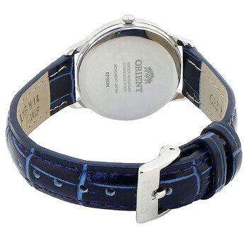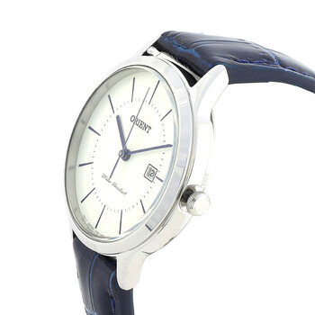 Silver-tone stainless steel case with a blue leather strap. Fixed silver-tone stainless steel bezel. White dial with blue hands and index hour markers. Minute markers around an inner ring. Dial Type: Analog. Date display at the 3 o'clock position. Quartz movement. Scratch resistant mineral crystal. Pull / push crown. Solid case back. Round case shape, case size: 30 mm, case thickness: 6 mm. Band width: 19 mm. Tang clasp. Water resistant at 30 meters / 100 feet. Functions: date, hour, minute, second. Contemporary Series. Casual watch style. Watch label: Japan Movt. Orient Contemporary Quartz White Dial Ladies Watch RF-QA0006S.