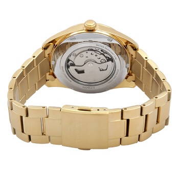 Gold-tone stainless steel case and bracelet. Fixed gold-tone stainless steel bezel. White dial with gold-tone hands and index hour markers. Minute markers around the outer rim. Dial Type: Analog. Luminescent hands. One subdial displaying: small second. Orient Calibre F6S22 automatic movement with a 40-hour power reserve. Scratch resistant sapphire crystal. Pull / push crown. Transparent case back. Round case shape, case size: 40.8 mm, case thickness: 10.9 mm. Band width: 22 mm. Fold over clasp with a safety release. Water resistant at 50 meters / 165 feet. Functions: hour, minute, small second. Contemporary Series. Casual watch style. Watch label: Japan Movt. Orient Contemporary Semi Skeleton Automatic White Dial Men's Watch RA-AR0007S10B.