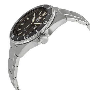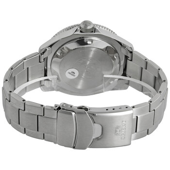 Stainless steel case wiuth a stainless steel bracelet. Uni-directional rotating stainless steel bezel with an inlaid black ring. Black dial with silver-tone hands and index hour markers. Minute markers around the outer rim. Dial Type: Analog. Luminescent hands and markers. Day of the week and date display at the 3 o'clock position. Orient calibre F6922 automatic movement, containing 22 Jewels, bitting at 21600 vph, and has a power reserve of approximately 40 hours. Scratch resistant mineral crystal. Screw down crown. Solid case back. Round case shape. Case size: 44 mm. Case thickness: 12.9 mm. Band width: 22 mm. Fold over clasp with a safety release. Water resistant at 200 meters / 660 feet. Functions: date, day, hour, minute, second. Kanno Series. Dive watch style. Watch label: Japan Movt. Orient Kanno Automatic Black Dial Men's Watch RA-AA0008B19A.