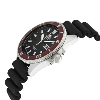 Silver-tone stainless steel case with a black rubber strap. Uni-directional rotating silver-tone stainless steel with a red metalic bezel. Black dial with luminous silver-tone hands and index hour markers. Minute markers around the outer rim. Dial Type: Analog. Luminescent hands and markers. Date display at the 3 o'clock position. Orient Calibre F6922 Automatic movement, containing 22 Jewels, bitting at 21600 vph, and has a power reserve of approximately 40 hours. Scratch resistant mineral crystal. Screw down crown. Solid case back. Round case shape, case size: 44 mm, case thickness: 13 mm. Band width: 21 mm. Tang clasp. Water resistant at 200 meters / 660 feet. Functions: date, day, hour, minute, second. Kanno Series. Sport watch style. Watch label: Japan Movt. Orient Kanno Automatic Black Dial Men's Watch RA-AA0011B19B.