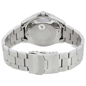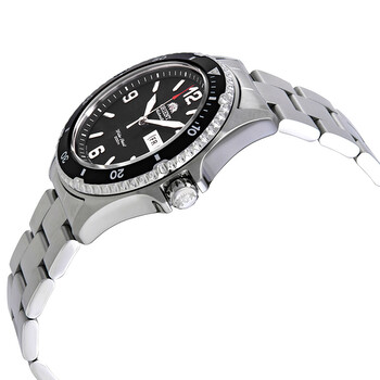 Stainless steel case with a stainless steel bracelet. Uni-directional rotating stainless steel bezel with a black top ring. Black dial with silver-tone hands and index hour markers. Arabic numerals mark the 6, 9 and 12 o'clock positions. Minute markers around the outer rim. Dial Type: Analog. Luminescent hands and markers. Day of the week and date display at the 3 o'clock position. Orient calibre F6922 automatic movement with a 40-hour power reserve. Scratch resistant mineral crystal. Screw down crown. Solid case back. Round case shape. Case size: 41 mm. Case thickness: 13 mm. Band width: 22 mm. Fold over clasp with a safety release. Water resistant at 200 meters / 660 feet. Functions: date, day, hour, minute, second. Dive watch style. Watch label: Japan Movt. Orient Mako II Automatic Black Dial Men's Watch FAA02001B9.