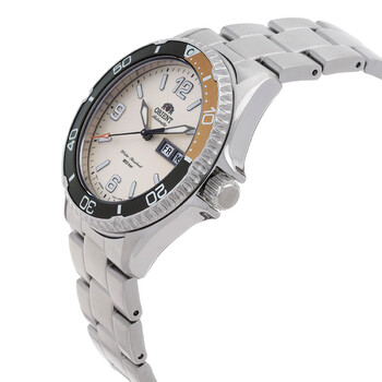 Silver-tone stainless steel case and bracelet. Uni-directional rotating silver-tone stainless steel bezel with an aluminum top ring. Silver dial with silver-tone hands and index-Arabic numeral hour markers. Arabic numeral marks the 6, 9 and 12 o'clock positions. Minute markers around the outer rim. Dial Type: Analog. Luminescent hands and markers. Day of the week and date display at the 3 o'clock position. Orient Calibre F6922 Automatic movement, containing 22 Jewels, bitting at 21600 vph, and has a power reserve of approximately 40 hours. Scratch resistant sapphire crystal. Screw down crown. Solid case back. Round case shape, case size: 42 mm, case thickness: 13 mm. Band width: 22 mm. Fold over clasp with a safety release. Water resistant at 200 meters / 660 feet. Functions: date, day, hour, minute, second. Mako IIi Kamasu R Series. Sport watch style. Watch label: Japan Movt. Orient Mako III Kamasu R Automatic Silver Dial Men's Watch RA-AA0821S19B.