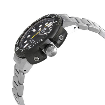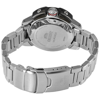Silver-tone stainless steel case and bracelet. Uni-directional rotating silver-tone stainless steel with an inlaid black ring bezel. Black dial with luminous silver-tone hands and dot hour markers. Minute markers around the outer rim. Dial Type: Analog. Luminescent hands and markers. Date display at the 3 o'clock position. Orient Calibre F6727 Automatic movement, containing 22 Jewels, bitting at 21600 vph, and has a power reserve of approximately 40 hours. Scratch resistant sapphire crystal. Screw down crown. Solid case back. Round case shape, case size: 45 mm, case thickness: 13.2 mm. Band width: 20 mm. Fold over with double push button release clasp. Water resistant at 200 meters / 660 feet. Functions: date, hour, minute, second. M-force Series. Casual watch style. Watch label: Japan Movt. Orient M-Force Automatic Black Dial Men's Watch RA-AC0L01B00B.