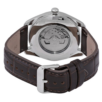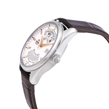 Stainless steel case with a brown leather strap. Fixed stainless steel bezel. White dial with rose gold-tone hands and index hour markers. Minute markers around the outer rim. Dial Type: Analog. Perpetual calendar markings. date display at the 3 o'clock position. Automatic movement. Scratch resistant mineral crystal. Pull / push crown. Solid case back. Round case shape. Case size: 44 mm. Case thickness: 12 mm. Band width: 22 mm. Tang clasp. Water resistant at 50 meters / 165 feet. Functions: month, date, day, hour, minute, second. Multi Year Series. Casual watch style. Watch label: Japan Movt. Orient Multi Year Automatic White Dial Men's Watch RA-BA0005S10B.