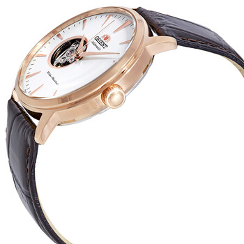 Rose gold-tone stainless steel case with a brown leather strap. Fixed rose gold-tone bezel. White (open heart) dial with rose gold-tone hands and index hour markers. Minute markers around the outer rim. Dial Type: Analog. Orient calibre F6T22 automatic movement, containing 22 Jewels, bitting at 21600 vph, and has a power reserve of approximately 40 hours. Scratch resistant mineral crystal. Pull / push crown. Transparent case back. Round case shape. Case size: 41 mm. Case thickness: 12 mm. Band width: 22 mm. Tang clasp. Water resistant at 30 meters / 100 feet. Functions: hour, minute, second. Casual watch style. Watch label: Japan Movt. Orient Open Heart Automatic White Dial Men's Watch FAG02002W0.