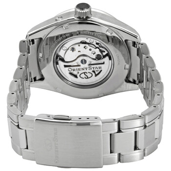 Stainless steel case with a stainless steel bracelet. Fixed stainless steel bezel. Black (open heart) dial with luminous silver-tone hands and index hour markers. Minute markers around the outer rim. Dial Type: Analog. Two sub-dials displaying: power reserve indicator and date/moon phase. Caliber F7M63 automatic movement with a 50-hour power reserve. Scratch resistant sapphire crystal. Pull / push crown. Transparent case back. Round case shape. Case size: 41 mm. Case thickness: 13.1 mm. Band width: 21 mm. Fold over clasp with a safety release. Water resistant at 100 meters / 330 feet. Functions: date, hour, minute, second, power reserve indicator, moon phase, open heart display, exhibition caseback. Orient Star Series. Sport watch style. Watch label: Japan Movt. Orient Orient Star Automatic Black Dial Men's Watch RE-AY0001B00B.