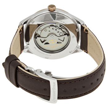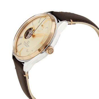 Stainless steel case with a brown leather strap. Fixed gold-tone bezel. Champagne (open hear) dial with rose gold-tone hands and index hour markers. Minute markers around the outer rim. Dial Type: Analog. Power reserve indicator subdials. Automatic movement. Scratch resistant mineral crystal. Pull / push crown. Transparent case back. Round case shape, case size: 40.4 mm, case thickness: 12.8 mm. Band width: 20 mm. Tang clasp. Water resistant at 50 meters / 165 feet. Functions: hour, minute, second. Orient Star Series. Dress watch style. Orient Orient Star Automatic Champagne Dial Men's Watch RE-AT0201G00B.