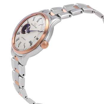 Stainless steel case with a two-tone (silver-tone and rose gold-tone) stainless steel bracelet. Fixed rose gold-tone bezel. White (open heart) dial with rose gold-tone hands and Roman numeral hour markers. Minute markers around the outer rim. Roman numeral marker appears at the 6 and 12 o'clock positions. Dial Type: Analog. Caliber 55C40 automatic movement with a 40-hour power reserve. Scratch resistant mineral crystal. Screw down crown. Transparent case back. Round case shape.Case size: 30 mm. Case thickness: 10 mm. Band width: 15 mm. Deployment clasp with a push button release. Water resistant at 50 meters / 165 feet. Functions: hour, minute. Orient Star Series. Casual watch style. Watch label: Japan Movt. Orient Orient Star Automatic White Dial Ladies Watch RE-ND0001S00B.