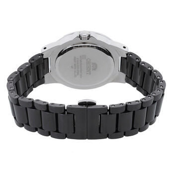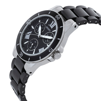 Grey stainless steel case with a grey ceramic bracelet. Black ceramic bezel. Black dial with silver-tone hands and Roman numeral hour markers. Minute markers around the outer rim. Dial Type: Analog. Luminescent hands. Quartz movement. Scratch resistant mineral crystal. Screw down crown. Round case shape, case size: 38 mm, case thickness: 10 mm. Fold over clasp. Water resistant at 50 meters / 165 feet. Functions: date, day, hour, minute, second. Watch label: Japan Movt. Item Variations: FUT0F004B,UT0F004B. Orient Quartz Black Dial Ladies Watch FUT0F004B0.