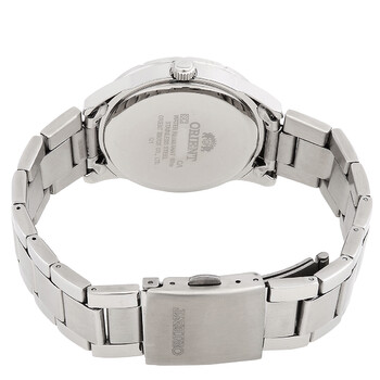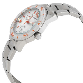Silver-tone stainless steel case and bracelet. Fixed white stainless steel bezel. White dial with index-Arabic numeral hour markers. Minute markers around the outer rim. Dial Type: Analog. Luminescent hands. Three sub-dials displaying: day, date and 24 hour. Quartz movement. Scratch resistant mineral crystal. Pull / push crown. Solid case back. Round case shape, case size: 39 mm. Fold over clasp with a safety release. Water resistant at 50 meters / 165 feet. Functions: date, day, hour, minute, second. Casual watch style. Watch label: Japan Movt. Orient Quartz White Dial Ladies Watch FUT0J003W.