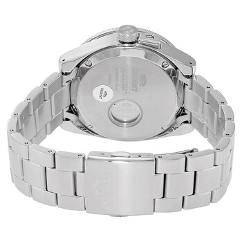 Stainless steel case with a stainless steel bracelet. Uni-directional rotating stainless steel bezel. Black dial with luminous silver-tone hands and index hour markers. Minute markers around the outer rim. Dial Type: Analog. Luminescent hands and markers. Small seconds sub-dial. Automatic movement. Scratch resistant mineral crystal. Pull / push crown. Solid case back. Round case shape. Case size: 40.8 mm. Case thickness: 12.6 mm. Band width: 20 mm. Fold over clasp. Water resistant at 50 meters / 165 feet. Functions: hour, minute, second. Retro Future Series. Dress watch style. Orient Retro Future Automatic Black Dial Men's Watch RA-AR0201B10B.