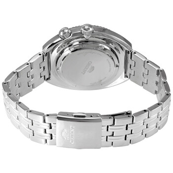 Stainless steel case with a stainless steel bracelet. Fixed stainless steel bezel. Blue dial with luminous silver-tone hands and dot hour markers. Minute markers. 24 hour markers around the outer rim. Dial Type: Analog. Luminescent hands and markers. Day of the week and date display at the 3 o'clock position. Automatic movement. Scratch resistant mineral crystal. Solid case back. Round case shape. Case size: 43.5 mm. Case thickness: 13.9 mm. Band width: 20 mm. Fold over clasp. Water resistant at 200 meters / 660 feet. Functions: date, day, hour, minute, second. Revival Series. Dress watch style. Watch label: Japan Movt. Orient Revival Blue Dial Men's Watch RA-AA0E03L19B.