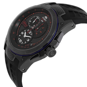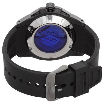 Black stainless steel case with a black rubber strap. Fixed black aluminum bezel. Black dial with index hour markers. Minute markers around the outer rim. Dial Type: Analog. Date display between 4 and 5 o'clock position. Orient Calibre KQA00 quartz movement. Scratch resistant sapphire crystal. Transparent case back. Round case shape, case size: 45 mm. Buckle clasp. Water resistant at 100 meters / 330 feet. Functions: chronograph, date, hour, minute, second. Speedtech Ers Series. Sport watch style. Watch label: Japan Movt. Orient Speedtech ERS Chronograph Quartz Black Dial Men's Watch SKT00003B.