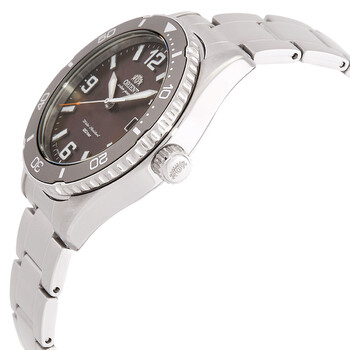 Silver-tone stainless steel case and bracelet. Uni-directional rotating grey stainless steel bezel. Brown dial with silver-tone hands and index-Arabic numeral hour markers. Minute markers around the outer rim. Dial Type: Analog. Luminescent hands and markers. Date display at the 3 o'clock position. Orient Calibre VS422 solar movement. Scratch resistant sapphire crystal. Screw down crown. Solid case back. Round case shape, case size: 39.9 mm, case thickness: 11.2 mm. Band width: 20 mm. Fold over clasp with a safety release. Water resistant at 200 meters / 660 feet. Functions: date, hour, minute, second. Sport Series. Sport watch style. Watch label: Japan Movt. Orient Sport Solar Brown Dial Men's Watch RA-WJ0004Y10B.