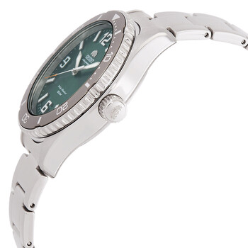 Silver-tone stainless steel case and bracelet. Uni-directional rotating grey stainless steel bezel. Green dial with silver-tone hands and index-Arabic numeral hour markers. Minute markers around the outer rim. Dial Type: Analog. Luminescent hands and markers. Date display at the 3 o'clock position. Orient Calibre VS422 solar movement. Scratch resistant sapphire crystal. Screw down crown. Solid case back. Round case shape, case size: 39.9 mm, case thickness: 11.2 mm. Band width: 20 mm. Fold over clasp with a safety release. Water resistant at 200 meters / 660 feet. Functions: date, hour, minute, second. Sport Series. Sport watch style. Watch label: Japan Movt. Orient Sport Solar Green Dial Men's Watch RA-WJ0001E10B.