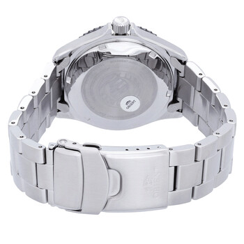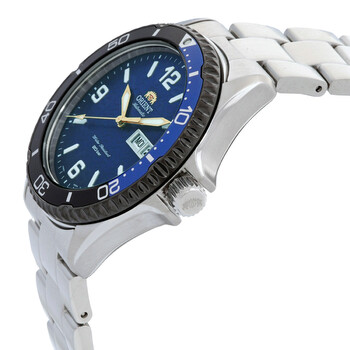 Silver-tone stainless steel case and bracelet. Uni-directional rotating two tone ( black & blue) bezel. Blue dial with silver-tone hands and index-Arabic numeral hour markers. Dial Type: Analog. Luminescent hands and markers. Day and date display at the 3 o'clock position. Orient Calibre F6922 Automatic movement, containing 22 Jewels, bitting at 21600 vph, and has a power reserve of approximately 40 hours. Scratch resistant sapphire crystal. Screw down crown. Round case shape, case size: 42 mm, case thickness: 13 mm. Band width: 22 mm. Fold over clasp with a safety release. Water resistant at 200 meters / 660 feet. Functions: date, hour, minute, second. Sports Series. Sport watch style. Watch label: Japan Movt. Orient Sports Automatic Blue Dial Men's Watch RA-AA0822L19B.