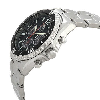 Silver-tone stainless steel case and bracelet. Uni-directional rotating silver-tone stainless steel bezel with a black top ring. Black dial with silver-tone hands and index hour markers. Minute markers around the outer rim. Dial Type: Analog. Date display between 4 and 5 o'clock position. Chronograph - three sub-dials displaying: 60 second, 60 minute and 24 hour. Orient Calibre VS752 solar movement. Scratch resistant sapphire crystal. Screw down crown. Solid case back. Round case shape, case size: 42.8 mm. Fold over clasp with a safety release. Water resistant at 200 meters / 660 feet. Functions: chronograph, date, hour, minute, second. Sports Series. Sport watch style. Watch label: Japan Movt. Orient Sports Solar Powered Chronograph Black Dial Men's Watch RA-TX0202B10B.