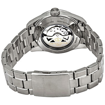 Stainless steel case with a stainless steel bracelet. Fixed stainless steel bezel. Blue (open heart) dial with luminous silver-tone hands and index hour markers. Roman numerals mark the 6 and 12 o'clock positions. Minute markers around the outer rim. Dial Type: Analog. Luminescent hands and markers. Date display at the 3 o'clock position. Power reserve indicator. Orient calibre F6N43 automatic movement with a 50-hour power reserve. Scratch resistant sapphire crystal. Screw down crown. Transparent case back. Round case shape. Case size: 38.5 mm. Case thickness: 12 mm. Band width: 22 mm. Fold over clasp. Water resistant at 100 meters / 330 feet. Functions: date, hour, minute, second, power reserve indicator. Casual watch style. Watch label: Japan Movt. Orient Star Automatic Blue Dial Men's Watch RE-AU0005L00B.