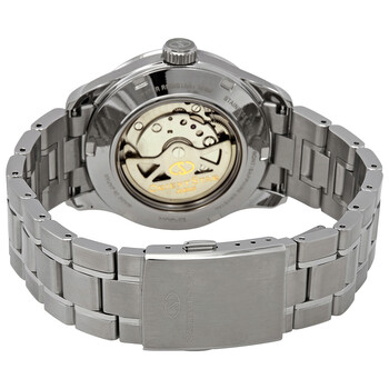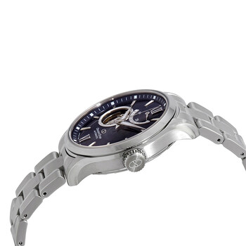 Stainless steel case with a stainless steel bracelet. Fixed stainless steel bezel. Blue (open heart) dial with luminous silver-tone hands and index hour markers. Roman numerals mark the 6 and 12 o'clock positions. Minute markers around the outer rim. Dial Type: Analog. Luminescent hands and markers. Power reserve indicator. Orient calibre F6R42 automatic movement with a 50-hour power reserve. Scratch resistant sapphire crystal. Screw down crown. Transparent case back. Round case shape. Case size: 39 mm. Case thickness: 12 mm. Band width: 20 mm. Fold over clasp. Water resistant at 100 meters / 330 feet. Functions: hour, minute, second, power reserve indicator. Casual watch style. Watch label: Japan Movt. Orient Star Automatic Blue Open Heart Dial Men's Watch RE-AT0001L00B.