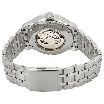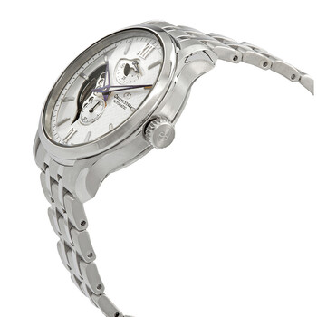 Stainless steel case with a stainless steel bracelet. Fixed stainless steel bezel. Silver (open heart) dial with luminous blue hands and index hour markers. Roman numeral markers at the 6 and 12 o'clock positions. Minute markers around the outer rim. Dial Type: Analog. Luminescent hands and markers. Two sub-dials displaying: 60 second and power reserve. Automatic movement with a 50-hour power reserve. Scratch resistant sapphire crystal. Pull / push crown. Transparent case back. Round case shape. Case size: 41 mm. Case thickness: 11.5 mm. Band width: 22 mm. Deployment clasp with a push button release. Water resistant at 100 meters / 330 feet. Functions: hour, minute, second, power reserve indicator. Orient Star Series. Dress watch style. Watch label: Japan Movt. Orient Star Automatic Open Heart Silver Dial Men's Watch RE-AV0B01S00B.