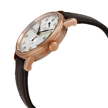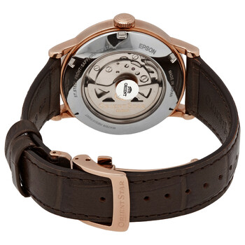 Rose gold-tone stainless steel case with a brown leather strap. Fixed rose gold-tone bezel. Silver dial with black hands and index hour markers. Minute markers around the outer rim. Dial Type: Analog. Date display at the 3 o'clock position. Two displays showing: small second and power reserve. Automatic movement. Scratch resistant sapphire crystal. Pull / push crown. Transparent case back. Round case shape. Case size: 38.7 mm. Case thickness: 12.5 mm. Band width: 19 mm. Fold over clasp. Water resistant at 50 meters / 165 feet. Functions: date, hour, minute, second, power reserve indicator. Star Series. Casual watch style. Watch label: Japan Movt. Orient Star Automatic Silver Dial Brown Leather Men's Watch RE-AW0003S00B.