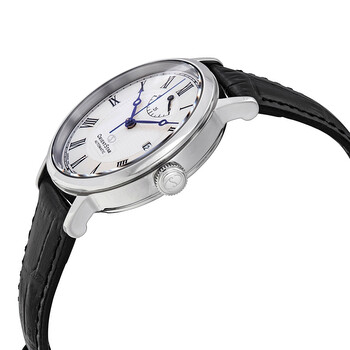 Stainless steel case with a black leather strap. Fixed stainless steel bezel. Silver-tone dial with blue hands and Roman numeral hour markers. Minute markers around the outer rim. Dial Type: Analog. Date display at the 3 o'clock position. Power reserve indicator. Automatic movement. Scratch resistant sapphire crystal. Pull / push crown. Transparent case back. Round case shape. Case size: 38.7 mm. Case thickness: 12.8 mm. Fold over clasp. Water resistant at 50 meters / 165 feet. Functions: date, hour, minute, second, power reserve indicator. Star Series. Casual watch style. Watch label: Japan Movt. Orient Star Automatic Silver Dial Men's Watch RE-AU0002S00B.
