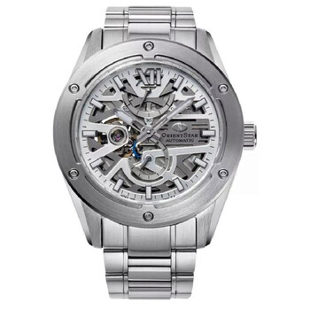 Silver-tone stainless steel case and bracelet. Fixed silver-tone stainless steel bezel. Skeleton dial with silver-tone hands and index hour markers. Minute markers around the outer rim. Dial Type: Analog. Two sub-dials displaying: small second and power reserve. Orient Calibre F8F64 automatic movement. Scratch resistant sapphire crystal. Transparent case back. Round case shape, case size: 42 mm, case thickness: 13 mm. Band width: 22 mm. Deployment with push button release clasp. Water resistant at 100 meters / 330 feet. Functions: hour, minute, small second, power reserve indicator. Orient Star Series. Sport watch style. Watch label: Japan Movt. Orient Star Automatic Skeleton Dial Men's Watch RE-BZ0001S00B.