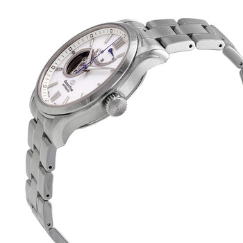 Stainless steel case with a stainless steel bracelet. Fixed stainless steel bezel. White (open heart) dial with luminous silver-tone hands and index hour markers. Roman numerals appear at the 6 and 12 o'clock positions. Minute markers around the outer rim. Power reserve indictaor. Dial Type: Analog. Luminescent hands. Orient caliber F6R42 automatic movement with a 50-hour power reserve. Scratch resistant sapphire crystal. Screw down crown. Transparent case back. Round case shape. Case size: 39 mm. Case thickness: 12 mm. Band width: 20 mm. Fold over clasp with a push button release. Water resistant at 100 meters / 330 feet. Functions: hour, minute, second. Orient Star Series. Dress watch style. Watch label: Japan Movt. Orient Star Automatic White Dial Men's Watch RE-AT0003S00B.