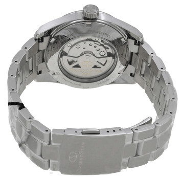 Silver-tone stainless steel case and bracelet. Fixed silver-tone stainless steel bezel. Copper dial with index-Roman numeral hour markers. Minute markers around the outer rim. Dial Type: Analog. Date display at the 3 o'clock position. One subdial displaying: power reserve indicator. Orient Calibre F6N43 Automatic movement, containing 22 Jewels, bitting at 21600 vph, and has a power reserve of approximately 50 hours. Scratch resistant sapphire crystal. Transparent see through case back. Round case shape, case size: 38.5 mm. Deployment with push button release clasp. Water resistant at 100 meters / 330 feet. Functions: date, hour, minute, second, power reserve indicator. Contemporary Series. Casual watch style. Watch label: Japan Movt. Orient Star Contemporary Automatic Copper Dial Watch RE-AU0108G00B.