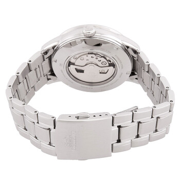 Stainless steel case with a stainless steel bracelet. Fixed stainless steel bezel. Black (open heart) dial with silver-tone hands and index hour markers. Roman numeral appears at the 12 o'clock position. Minute markers around the outer rim. Dial Type: Analog. Sun and moon display. Automatic movement. Scratch resistant sapphire crystal. Pull / push crown. Transparent case back. Round case shape. Case size: 42 mm. Case thickness: 13 mm. Band width: 22 mm. Deployment clasp with a push button release. Water resistant at 30 meters / 100 feet. Functions: hour, minute, second. Sun And Moon Series. Dress watch style. Orient Sun and Moon Automatic Black Dial Men's Watch RA-AS0008B10B.