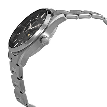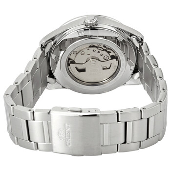Stainless steel case with a stainless steel bracelet. Fixed stainless steel bezel. Black dial with silver-tone hands and index hour markers. Minute markers around the outer rim. Dial Type: Analog. Date display at the 3 o'clock position. Day of the week sub-dial. Sun / moon display. Automatic movement. Scratch resistant sapphire crystal. Pull / push crown. Transparent case back. Round case shape. Case size: 42 mm. Case thickness: 12 mm. Band width: 22 mm. Deployment clasp with a push button release. Water resistant at 50 meters / 165 feet. Functions: date, day, hour, minute, second. Sun & Moon Series. Dress watch style. Orient Sun Moon Automatic Black Dial Men's Watch RA-AK0307B10B.