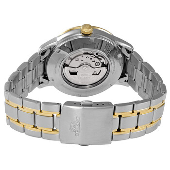 Stainless steel case with a two-tone (silver-tone and yellow gold-tone) stainless steel bracelet. Fixed yellow gold-tone bezel. Silver (open heart) dial with yellow gold-tone hands and index hour markers. A Roman numeral appears at the 12 o'clock positions. Minute markers around the outer rim. Dial Type: Analog. Sun / moon sub-dial. Automatic movement. Scratch resistant sapphire crystal. Pull / push crown. Solid case back. Round case shape. Case size: 42 mm. Case thickness: 12 mm. Band width: 21 mm. Deployment clasp with a push button release. Water resistant at 50 meters / 165 feet. Functions: hour, minute, second. Sun & Moon Series. Casual watch style. Orient Sun Moon Automatic Silver Dial Men's Watch RA-AS0007S10B.