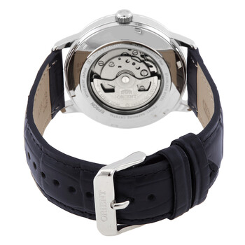 Silver-tone stainless steel case with a navy blue leather strap. Fixed silver-tone stainless steel bezel. Blue dial with silver-tone hands and index-Roman numeral hour markers. Minute markers around the outer rim. Roman numerals at 3,6,9 and 12 o clock positions. Dial Type: Analog. Date display at the 3 o'clock position. Orient Calibre F6722 Automatic movement, containing 22 Jewels, bitting at 21600 vph, and has a power reserve of approximately 40 hours. Scratch resistant sapphire crystal. Pull / push crown. Transparent see through case back. Round case shape, case size: 41.6 mm, case thickness: 11.7 mm. Band width: 22 mm. Tang clasp. Water resistant at 50 meters / 165 feet. Functions: date, hour, minute, second. Symphony IV Series. Casual watch style. Watch label: Japan Movt. Orient Symphony IV Automatic Blue Dial Men's Watch RA-AC0F11.