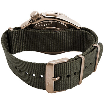 Rose gold-tone stainless steel case with a green nylon strap. Uni-directional rotating stainless steel bezel with a green and orange ring. Green dial with luminous silver-tone hands and dot hour markers. Minute markers around the outer rim. Dial Type: Analog. Luminescent hands and markers. Date display at the 4 o'clock position. Orient calibre F6722 automatic movement, containing 22 Jewels, bitting at 21600 vph, and has a power reserve of approximately 40 hours. Scratch resistant sapphire crystal. Screw down crown. Solid case back. Round case shape. Case size: 43.4 mm. Case thickness: 12.8 mm. Band width: 22 mm. Tang clasp. Water resistant at 200 meters / 660 feet. Functions: date, hour, minute, second. Triton Series. Dive watch style. Watch label: Japan Movt. Orient Triton Automatic Green Dial Men's Watch RA-AC0K04E10B.