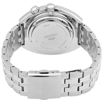 Silver-tone stainless steel case and bracelet. Bi-directional rotating silver-tone bezel. Blue dial with silver-tone hands and Arabic numeral hour markers. Dial Type: Analog. Luminescent hands and markers. Date display at the 3 o'clock position. Orient Calibre F6922 Automatic movement, containing 22 Jewels, bitting at 21600 vph, and has a power reserve of approximately 40 hours. Scratch resistant mineral crystal. Screw down crown. Solid case back. Round case shape, case size: 43.5 mm. Deployment with push button release clasp. Water resistant at 200 meters / 660 feet. Functions: date, day, hour, minute, second. World Map Revival Series. Dive watch style. Watch label: Japan Movt. Orient World Map Revival Automatic Blue Dial Men's Watch RA-AA0E03L09C.